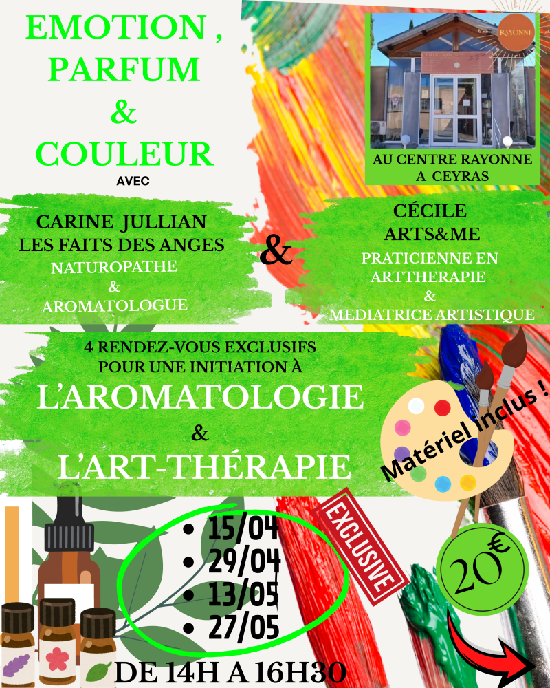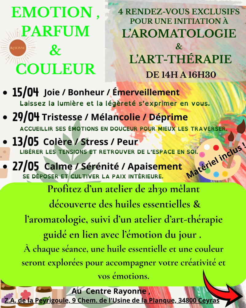 Une initiation à l’aromathéologie et à l’art-thérapie pour explorer vos émotions à travers les huiles essentielles et les couleurs, et créer votre propre tableau inspiré de l’émotion du jour.